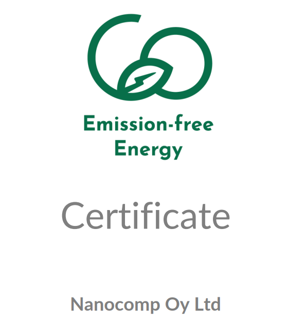 Nanocomp has contracted emission-free electricity supply for 2025 with Pohjois-Karjalan Sähkö Oy, in accordance with the European Guarantee of Origin system.