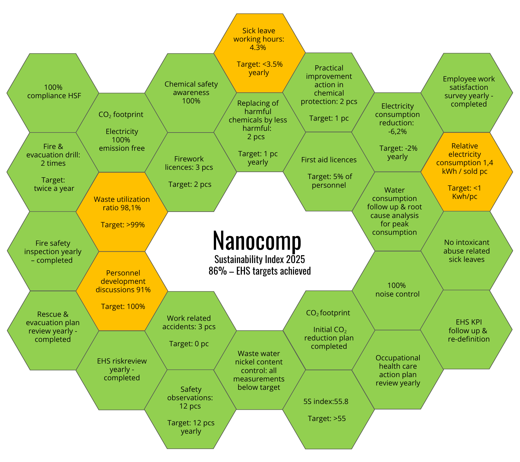 Our Sustainability Index reflects our annual EHS performance. Nanocomp Sustainability Index 2025: 86% – EHS targets largely achieved.